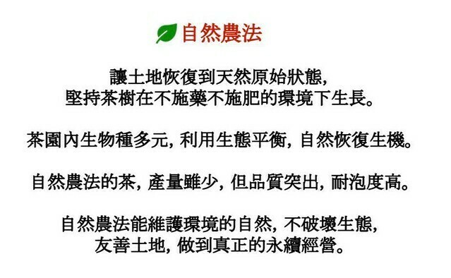 自然農法所產出之茶葉,由於種植茶葉之農地為未經開發的土地,且不含任何人工施肥藥品,